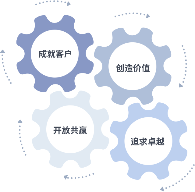 成就客户是一切决策的出发点,,,,创造价值是衡量所有工作的标准,,追求卓越是我们做事做人的态度,,开放共赢是我们的格局也是最终的结果。。。价值观的齿轮环环相扣,,推动着组织里的每个人不断向前。。。。