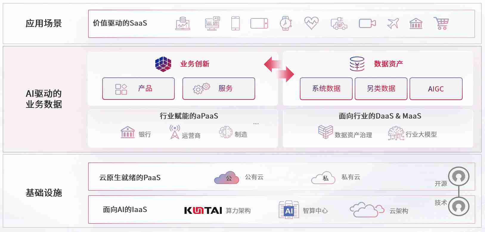 数字时代,,,围绕企业数字化转型的关键要素,,,凯时尊龙数码开创性的提出数云融合战略和技术体系框架,,,,着力在云原生、、数字原生、、AI原生和信创产业上架构产品和服务能力,,为处在不同数字化转型阶段的快消零售、、汽车、、、金融、、、医疗、、、政企、、、教育、、、运营商等行业客户提供泛在的敏捷IT能力和融合的数据驱动能力,,,构建跨界融合创新的数字业务场景和新业务模式,,助力企业级客户建立面向未来的核心能力和竞争优势,,,,全面推动社会的数字化、、、智能化转型升级。。。。
